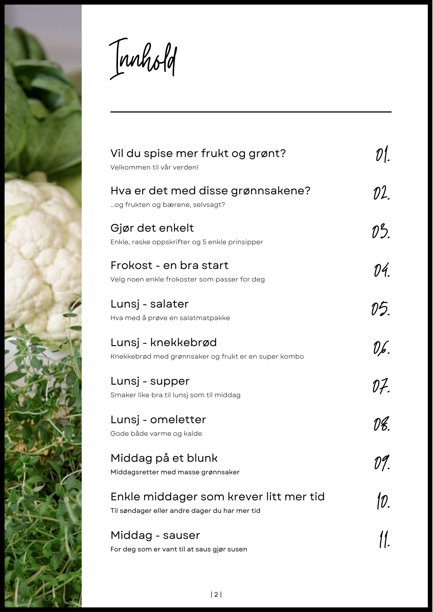 Så hva har vi gjort? Jo, vi har tatt utgangspunkt i oppskrifter vi liker og pimpet dem opp med MASSE frukt og grønt. Vi har tatt både to- og tre-gangeren. Og resultatet: Et kosthold som inneholder de (minst) 500 til 800 g frukt og grønt om dagen blir lett som en plett! Kokeboken gir deg over 50 oppskrifter på sunne, enkle og kjappe frokoster, lunsjer og middager. Under kan du se noe av innholdet for å få et inntrykk.
